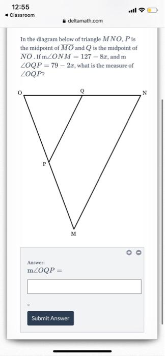 In the diagram below of triangle MNO, P is the midpoint of overline MO and Q is the midpoint of overline NO 、If mangle ONM=127-8x , and mangle OQP=79-2x ...