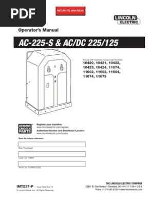 Hi all, we are new around here. We need a parts manual for a lincwelder 225 and where we can buy parts from. If anyone has any info on either of these it would be greatly appreciated. Please send all info to leadfoot21087@hotmail.com. Thanks. Hank and Matt. J. Find operator's manuals for your Lincoln Electric welders, wirefeeders, guns ... Parts page listings can be found at Service Navigator. * Use K# for guns, helmets, and weld fume control ... Description. 11675. IMT237. AC/DC 225/125 ARC - 11675. Operator Manual English. 11674. IMT237. AC 225 ARC - 11674. Operator Manual English. 10429. IMT237 ...