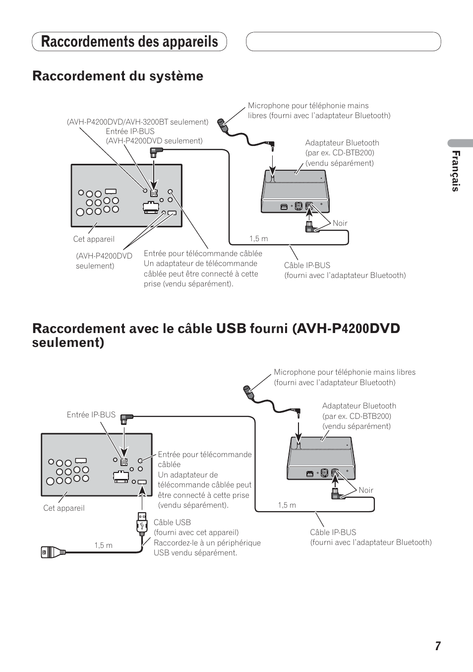 Pioneer AVH-P4200DVD Operation Manual. Dvd av receiver. Page 97 Connecting the units When connecting with optional CD-IU200V cable (AVH- P4200DVD only) Microphone for hands-free phoning (supplied with Bluetooth adapter) IP-BUS input AUX input (AUX) Bluetooth adapter Wired remote...