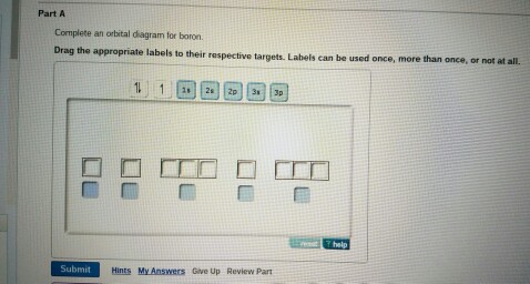 Complete an orbital diagram for boron. Drag the appropriate labels to their respective targets. Labels can be used once, more than once, or not at all. Part B Complete an orbital diagram for scandium (Sc). Drag the appropriate labels to their respective targets. Labels can be used once, more than once, or not at all. Part C