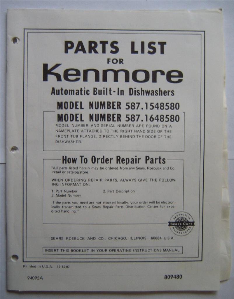 Parts List For Kenmore Automatic Built In Dishwasher Model 587 1548580 587 1648580 Sears Amazon Com Books