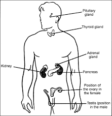 i) Draw a diagram to show the position of various endocrine glands. Label pituitary gland, thyroid gland, adrenal gland, pancreas, ovary and testes. (ii) Name the hormones released by ovary and testes. (