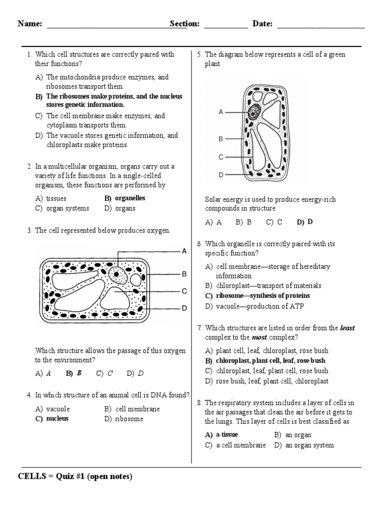 4. The diagram below represents a cell of a green plant. Which structure allows the passage of this oxygen to the environment? Solar energy is used to produce energy- rich compounds in structure. 5. Which row in the chart below contains a cell structure paired with its primary function?