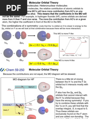 Energy-Level Diagrams. Because electrons in the σ 1 s orbital interact simultaneously with both nuclei, they have a lower energy than electrons that interact with only one nucleus. This means that the σ 1 s molecular orbital has a lower energy than either of the hydrogen 1s atomic orbitals. Conversely, electrons in the \( \sigma _{1s}^{\star } \) orbital interact with only one hydrogen ... It is said that the 1s orbital of hydrogen overlaps and fuses with the 2p orbital of fluorine in a molecule of HF. According to Molecular Orbital Theory, the 2s orbital of F is non-bonding, and the 2pz orbital of F combines with 1s of H. HF Polarity. Polarity is yet another important topic of chemistry that we are going to discuss in this article. The molecular orbital diagram of HF looks different than most other diatomic species because the electronegativity difference between H and F is so large. The 1s atomic orbital of H interacts with just one of the 2p atomic orbitals of F to form a bonding o molecular orbital and an antibonding o molecular orbital. The bond order is Figure The molecular orbital energy-level diagram for both the NO+ and CN-ions. Figure A partial molecular orbital energy-level diagram for the HF molecule. This interaction introduces an element of s-p mixing, or hybridization, into the molecular orbital theory. The. Molecular geometry of Cl2 Hybridization of Cl2.