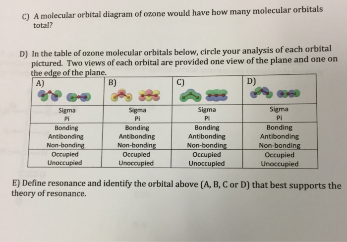 A molecular orbital diagram of ozone would have how many molecular orbitals total? In the table of ozone molecular orbitals below, circle your analysis of each orbital pictured. Two views of each orbital are provided one view of the plane and one on the edge of the plane. Define resonance and identify the orbital above (A, B, C or D) that best ...