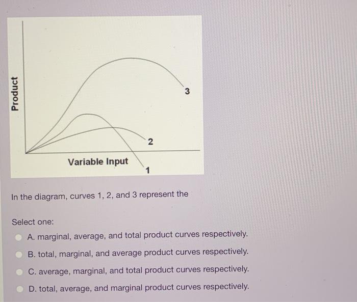 In the above diagram curves 1, 2, and 3 represent the: A. average, marginal, and total product curves respectively.