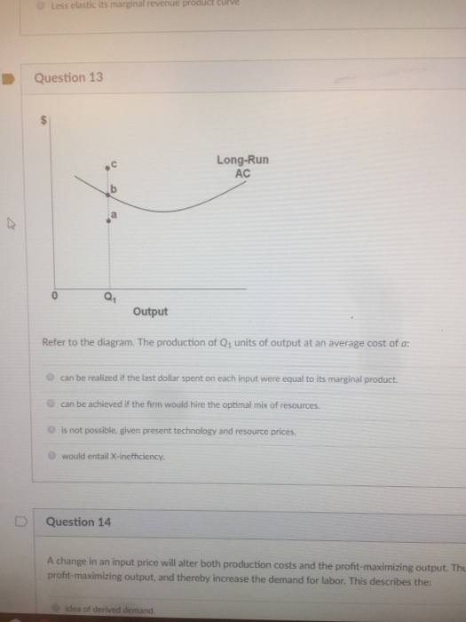 Economics questions and answers. Long-Run AC 0 Output Refer to the diagram. The production of units of output at an average cost of a Multiple Choice can be achieved if the firm would hire the optimal mix of resources. would entail X-inefficiency is not possible. given present technology and resource prices can be realized if the last dollar ...