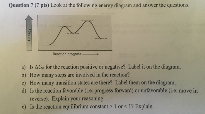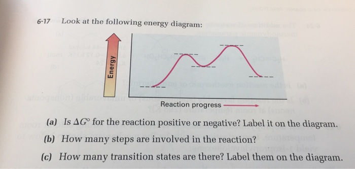 Jan 21, 2021 · 1 Answer to Look at the following energy diagram: (a) Is ?G° for the reaction positive or negative? Label it on the diagram. (b) How many steps are involved in the reaction? (c) How many transition states are there? Label them on the diagram.
