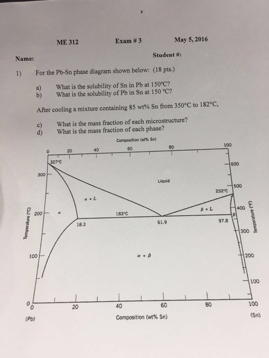 Phase Diagrams • Indicate phases as function of T, Co, and P. • For this course:-binary systems: just 2 components.-independent variables: T and Co (P = 1 atm is almost always used). • Phase Diagram for Cu-Ni system Adapted from Fig. 9.3(a), Callister 7e. (Fig. 9.3(a) is adapted from Phase Diagrams of Binary Nickel Alloys , P. Nash Figure 1 shows the Pb-Sn phase diagram and the composition for present experiments, in which it is very clear that the eutectic temperature is 183 • C, and the liquid-solid transition temperature... Watch this video lecture (Lecture 10) in Material Science at Mech Online Lectures to know about Lead Tin ( Pb-Sn ) Phase Diagram. Simple explanation of Eutec... The Attempt at a Solution. It is probably an easy question, but I thought it is a good idea to consult first. a) At 183 C, the first liquid phase forms. b) We can draw a tie line and the point intersects with the liquidus line, gives us the composition of liquid. It is 61.9 wt % Sn. c) It is around 250 C. Because phase diagram is on liquidus line.