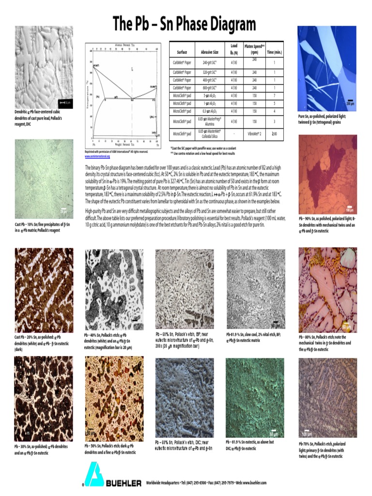 The (Sn) phase is the primary phase in all cases. Under Scheil conditions the alloy Sn-.04Bi-.06Pb encounters the L -> (Sn) + (Pb) monovariant eutectic where both phases form simultaneously from the liquid phase. The path encounters then the four phase reaction, L + (Pb) -> (Sn) + epsilon. Under Scheil assumptions fraction and concentration ... Important: This is a simplified version of the real tin-lead phase diagram.In particular, it ignores the formation of solid solutions of tin and lead. You will find the correct diagram on this NIST web page.Beware that on that page, the tin-lead axis is reversed from the one I have drawn above - in other words 100% lead is on the right rather than the left. 9.38 On the basis of the photomicrograph (i.e., the relative amounts of the microconstituents) for the lead- tin alloy shown in Figure 9.17 and the Pb-Sn phase diagram (Figure 9.8), estimate the composition of the alloy, and then compare this estimate with the composition given in the figure legend of Figure 9.17. Phase Struktur-bericht Symbol Common Names Prototype Spacegroup Model * Liquid: n/a: L: n/a: n/a (Bi,Pb,Sn) 1 : Fcc: A1 (Pb) Cu: Fm-3m (Bi,Pb,Sn) 1 (Va) 1: Hcp: A3 (epsilon Pb) Mg: P6 3 /mmc (Bi,Pb,Sn) 1 (Va) 0.5: Rho: A7 (Bi) alpha As: R-3m (Bi,Pb,Sn) 1 *