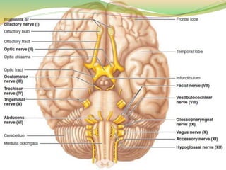 Cranial Nerves. The cranial nerves are composed of twelve pairs of nerves that emanate from the nervous tissue of the brain.In order to reach their targets they must ultimately exit/enter the cranium through openings in the skull.Hence, their name is derived from their association with the cranium. The following are the list of cranial nerves, their functions, and tumor examples: