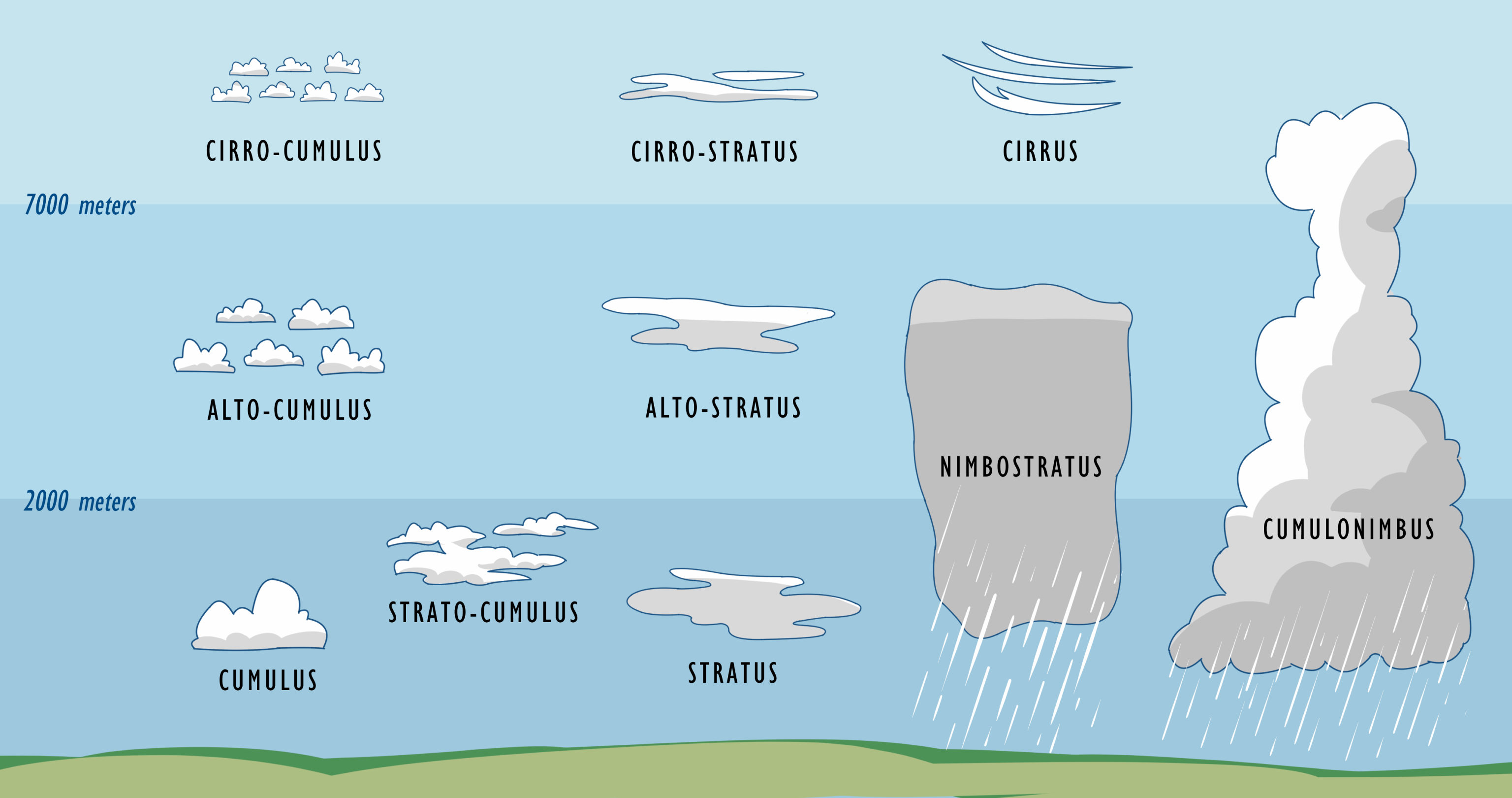 NCERT Notes: Types Of Clouds - Cirrus, Cumulus, Stratus ... Types of Clouds - UPSC Notes:-Download PDF Here. Frequently Asked Questions related to Types of Clouds. What are the 3 main types of clouds? Cumulus, Stratus, and Cirrus. There are three main cloud types. Cumulus clouds are the puffy clouds that look like puffs of cotton. Cumulus clouds that do not get very tall are indicators of fair weather.. Cloud Types | Center for Science Education Clouds are given different names based on their shape and their height in the sky. Some clouds are puffy like cotton while others are grey and uniform. Some clouds are near the ground, while others are near the top of the troposphere. The diagram on the right shows where different types of clouds are located in the sky. How Are Clouds Classified? Types of Clouds Diagram - Super Teacher Worksheets Types of Clouds Diagram. This is a printable diagram on the types of clouds: cirrostratus, cirrus, cirrocumulus, altocumulus, altostratus, cumulonimbus, stratus, cumulus, and nimbostratus. Super Teacher Worksheets has many weather worksheets for elementary grade levels. Log In.