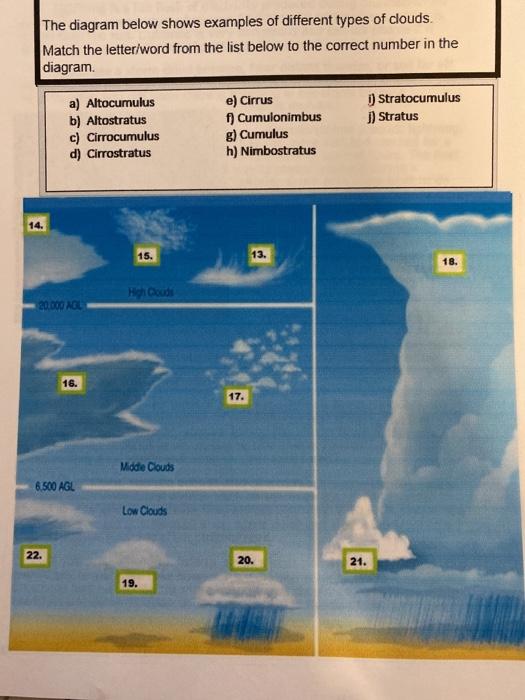 Types of clouds diagram. Types of Clouds Diagram | Quizlet Types of Clouds STUDY PLAY flat on the bottom and fluffy on the top cumulus clouds form high in the sky cumulus clouds usually mean fair weather cumulus clouds thin and feathery cirrus clouds made of ice crystals cirrus clouds made of ice crystals cirrus clouds form high in the sky and bring fair weather cirrus clouds gray blanket type clouds The 10 Basic Types of Clouds and How to Recognize Them Thus, the 10 types are: Low-level clouds (cumulus, stratus, stratocumulus) that lie below 6,500 feet (1,981 m) Middle clouds (altocumulus, nimbostratus, altostratus) that form between 6,500 and 20,000 feet (1981-6,096 m) High-level clouds (cirrus, cirrocumulus, cirrostratus) that form above 20,000 feet (6,096 m) Types Of Clouds The Atmosphere Stock Vector - Illustration ... Types of clouds the atmosphere. Illustration about education, scheme, wind, cumulus, precipitation, cumulonimbus, nature, clouds, altocumulus, teaching, learning, nimbostratus - 77848951 ... Diagram of cloud types and their location and education depending on the height in the atmosphere. Infographics arrangement of clouds in the atmosphere. How to Identify the 10 Different Types of Clouds Both these cloud types have similar wispy shapes, but cirrostratus clouds cover much more of the sky compared to cirrus clouds. Cirrus clouds will have lots of blue sky accompanying them, while for cirrostratus clouds, little or no sky will be visible, and the sun will likely be behind the clouds (typically with a "halo" around it).
