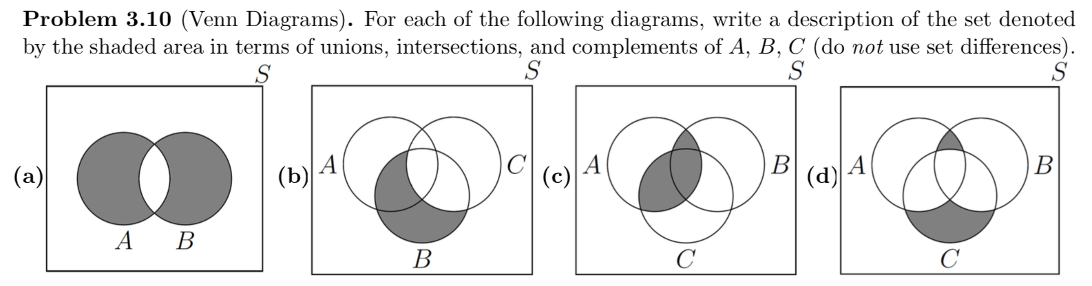 Union, Intersection, and Complement | Mathematics for the Liberal Arts Perform the operations of union, intersection, complement, and difference on sets using proper notation. Be able to draw and interpret Venn diagrams of set relations and operations and use Venn diagrams to solve problems. Recognize when set theory is applicable to real-life situations, solve...
