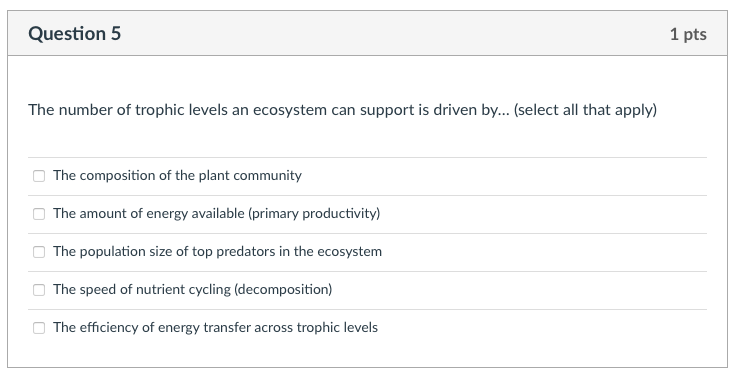 Which of the following statements is supported by the trophic relationships shown in the diagram?. Which of the following statements is supported by the trophic relationships shown in the diagram. Some charts are not available for some years. These are also the basis of most food web. Chapter 4 - Ecosystems: Components, Energy Flow, and Matter Cycling Chapter 5 ... Which of the following statements is supported by the trophic relationships shown in the diagram? Energy that is not passed on from one trophic level to the next is _____. Only 10 percent of the energy stored in an organism can be passed onto the next trophic level; How is energy transferred from one trophic level to the next? select all that ... Section 1, p. 8 The feeding relationships among all the species in a community can involve numerous trophic levels and many separate food chains. If you create a diagram that connects different species and food chains together based on these relationships, the result is called a food web diagram. Which of the following statements is supported by the trophic relationships shown in the diagram? Which statement is true of the atom shown in the diagram? Which statement regarding the ecosystem shown in the diagram below is correct; Which correctly matches numbers with structures in the diagram of a muscle shown?