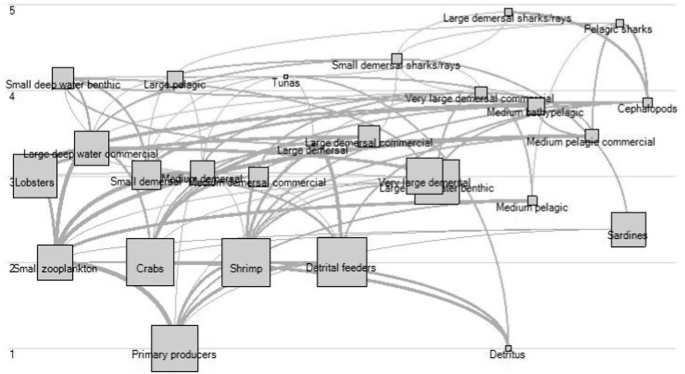The food web diagram shows feeding relationships between organisms on the ... Which of the following best explains the unique shape of the trophic pyramid? Which of the following statements is supported by the trophic relationships shown in the diagram? Squids eat fishes.
