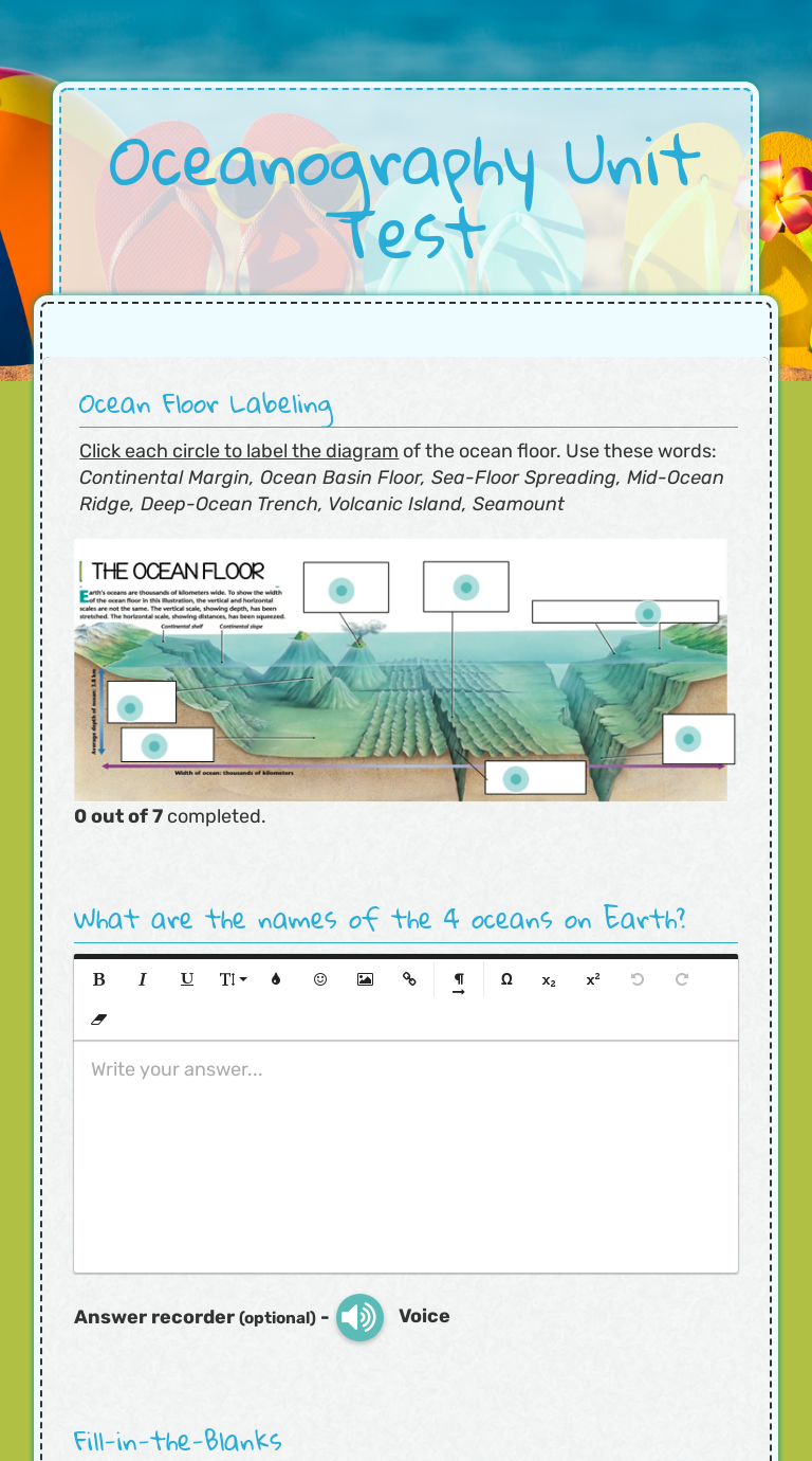 PDF Marine Conservation Science & Policy: Ocean Zones • Identify the 5 ocean zones. • Compare and contrast the conditions in the different zones. • Demonstrate knowledge by drawing a scale diagram of the five ocean zones. This will be a project-based activity in which students will work together to draw a scale diagram of the ocean zones. Background Ocean Floor Diagram Worksheet Answers - Home Alqu The Ocean Floor And S Zones Worksheet For 7th 10th Grade. Paleomagnetism And The Ocean Floor Geoscience. See also Small House Plans With Second Floor Balcony. Seafloor Spreading Worksheet Pdf Answer Key Fill Online. Oceanography Worksheet 1. See also How To Sand Wood Floors And Stain. Ocean Habitats and Animal Adaptations | National Geographic ... 1. Introduce ocean habitats. Go to the NOAA/National Weather Service’s Profile of the Ocean diagram. Discuss the significance of the depths shown on this diagram. Point out to students that the deepest part of the ocean shown is 11,000 meters (36,100 feet), or approximately 11 kilometers (7 miles) deep.