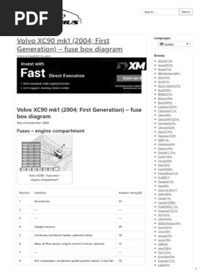 Volvo XC90 mk1 (2004; First Generation) - fuse box diagram ... Volvo XC90 mk1 (2004; First Generation) - fuse box diagram Year of production: 2004 Fuses - engine compartment Position Function Ampere rating [A] 1 Accessories 25 2 — — 3 — — 4 Oxygen sensors 20 5 Crankcase ventilation heater, solenoid valves 10 6 Mass air flow sensor, engine control module, injectors 15 7 — …