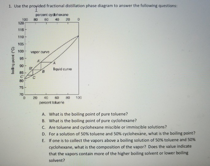 Fractional Distillation Phase Diagram. WWU -- Chemistry. Fractional Distillation Phase Diagram. The arrows indicate a theoretical plate! On the right side of the diagram: The azeotrope is the lower boiling compound, and it will be removed first. Pure ethanol will distill once the azeotrope has distilled. Separation by Fractional Distillation - GeeksforGeeks Fractional Distillation is used to separate miscible liquids that are volatile in nature. The boiling points of these liquids are close enough. One phase is the aqueous phase and the other phase is an organic solvent. This separation is based on the differences in the densities of the liquids. Chapter 8 Phase Diagrams In Fractional distillation, the boiling and condensation cycle is repeated successively. A maximum in a phase diagram may occur when favorable interactions between A and B molecules reduce the vapor pressure of the mixture below the ideal value. Raoult's Law and ideal mixtures of liquids - chemguide Using the phase diagram. The diagram is used in exactly the same way as it was built up. If you boil a liquid mixture, you can find out the temperature it boils at, and the composition of the vapour over the boiling liquid. ... The beginnings of fractional distillation.
