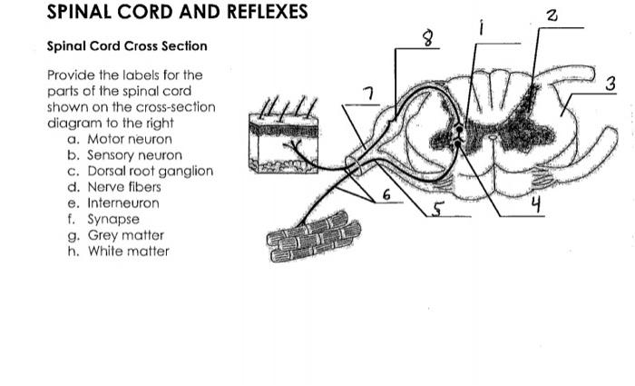 PDF Scanned Document - Bronx High School of Science SPINAL CORD AND REFLEX ACT Cross Section of Spinal Cord Label the following parts of a spinal cord on the cross-section diagram. Name a, b. c. Spinal Cord Anatomy - Parts and Spinal Cord Functions A spinal needle is inserted between two vertebrae at level L3/L4 or L4/L5, where there is no risk of accidental injury to the spinal cord (which ends at L1 to L2). Cross-Sectional Anatomy of Spinal Cord. The spinal cord, like the brain, consists of two kinds of nervous tissue called gray and white matter.