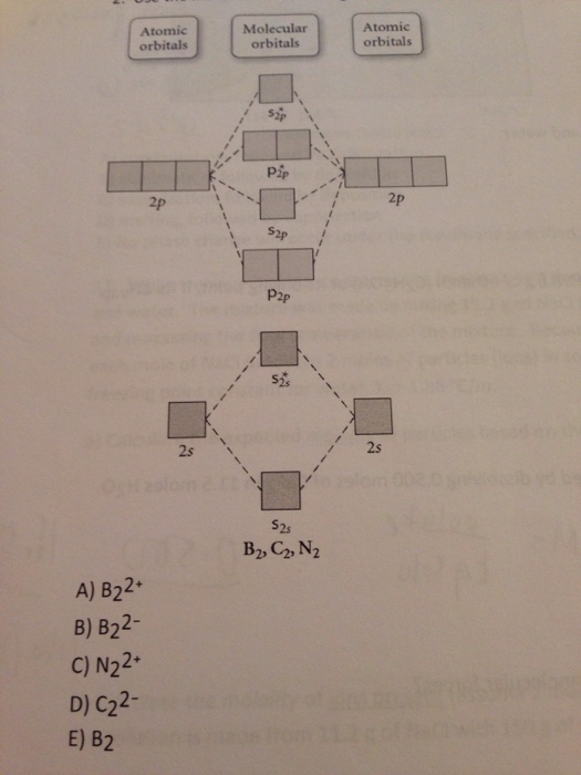 Recitation Week 10 (test 3 - Recitation 2) - GitHub Pages 2) Use molecular orbital diagrams to determine which of the following are paramagnetic. A) O2^2- B) Ne2^2+ C) O2^2+ D) F2^2+ E) None of the above are paramagnetic 3) Draw the molecular orbital diagram needed, and determine which of the following is paramagnetic. A) B2^2+ B) B2^2- C) N2^2+ D) C2^2- E) B2 Solved Molecular Orbital theory predicts that the B2 2 ... Molecular Orbital theory predicts that the B2 2- ion would have a bond order of _____. If one of the highest valence electron(s) was excited into the next highest energy molecular orbital, it would_____. a. 1,strengthen the bonding in the molecule b. 2, have no effect on the bonding strength of the molecule c. 2, strengthen the bonding in the ... M.O. Diagram for B2 - CHEMISTRY COMMUNITY When you write the M.O. Diagram for B2, this is what you get: This shows two unpaired electrons in π2px and π2pz. However, the Bond Order of B2 = 1/2 (4-2) = 1. Doesn't this mean that B2 has a single bond between the two Boron atoms--therefore they have one sigma bond?