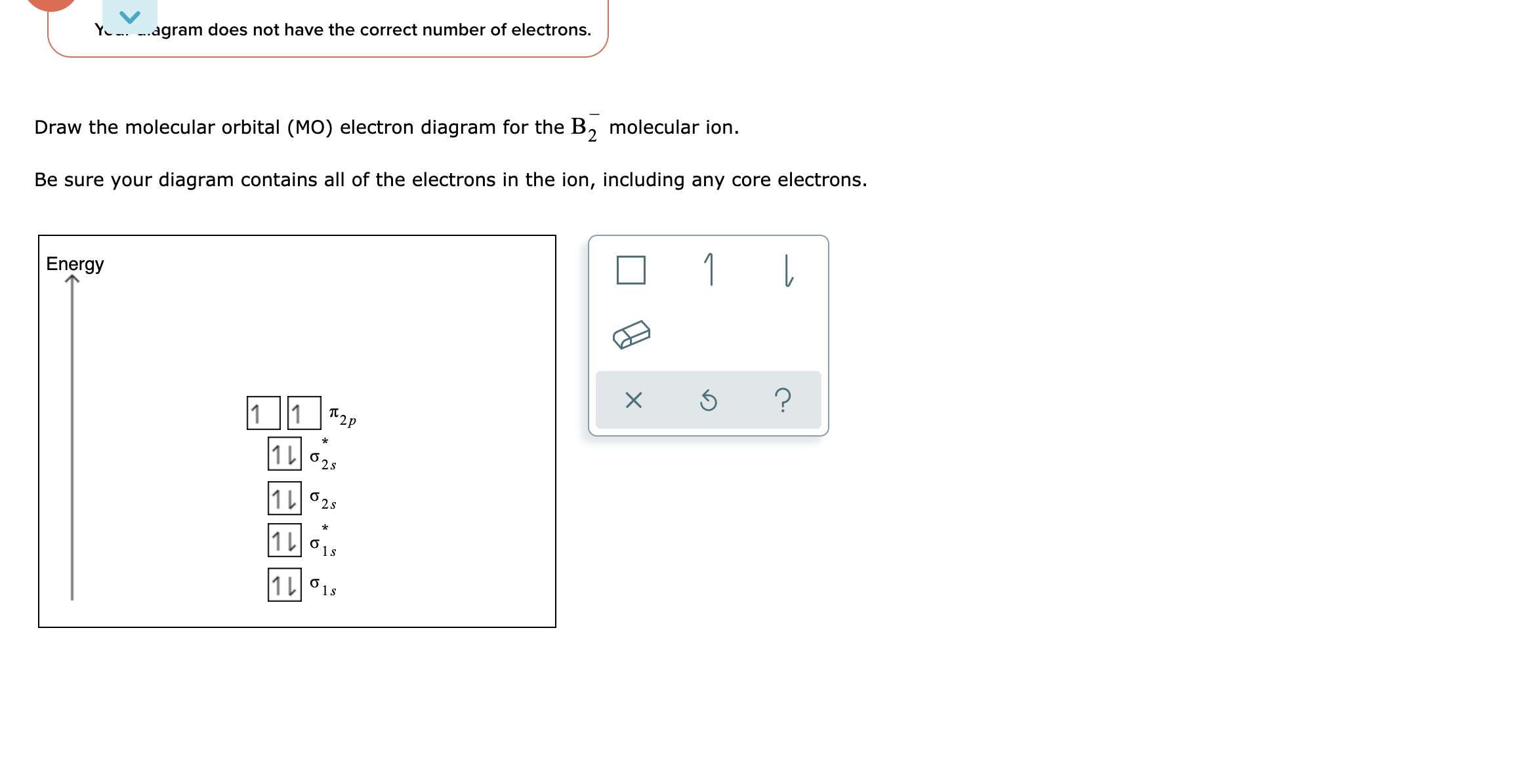 What Is The Bond Order Of B2 1 So the bond order of B2 is equal to 1, which you can get by drawing the molecular orbital diagram and performing the equation Bond Order = . 5 * (# of bonding electrons - # of antibonding electrons). However, when you draw the Lewis structure of B2, you get a triple bond. Nov 11, 2016 What is the molecular orbital diagram for C_2^-? | Socratic Explanation: The problem provides you with the MO diagram for the C2 molecule, so all you really have to do here is add an electron to that diagram. You need to add an electron and not remove one because of the overall negative charge that exists on the molecule. As you know, a neutral carbon atom has a total of 6 electrons.