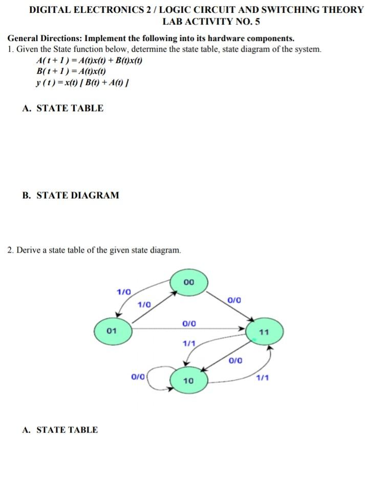 State Diagram | How to Design State Diagram | Uses | Example A state diagram is used to design the dynamic aspect of the system. It defines the state of the components and state changes triggered by an event. Events are internal and external factors influencing the system. During system implementation, it is important to clarify the different states of the object during its lifetime. Welcome to Real Digital A state diagram represents states with circles, and transitions between states by arrows exiting one circle and arriving at another. A binary number called the state code can be written in the state-circle to indicate the value stored in the state register when the state machine is in that state. PDF Circuits with Flip-Flop = Sequential Circuit Circuit ... Circuit, State Diagram, State Table. ... Flip-flop(s) Clock Logic gates Input Output Circuit, State Diagram, State Table. State diagram: Circle => state Arrow => transition input/output Circuit, State Diagram, State Table. State table: Left column => current state Top row => input combination