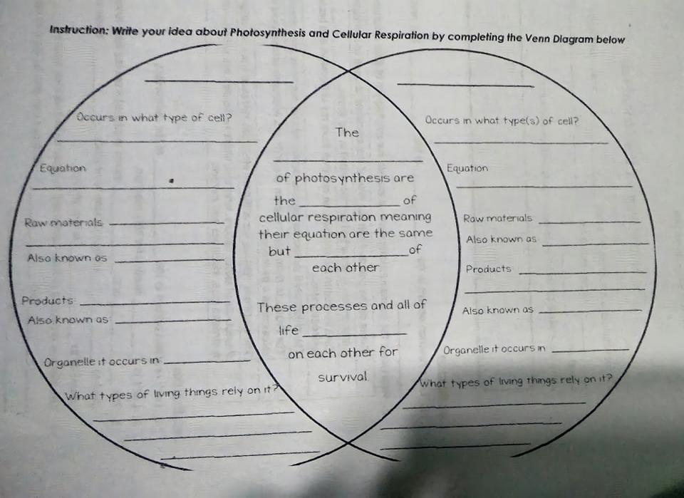 Cellular Energy Worksheet Answers - WorksheetWorks.cyou The first stage of cellular respiration. Answers will vary but may include movement and muscle contraction biochemical reactions and growth and metabolism. Write the equation for the balanced photosynthesis reaction in the space below. Mitochondria are the sites of cellular respiration where energy is produced. Photosynthesis and Cellular Respiration Venn Diagram 2. Understand Interactive Venn Diagram. Photosynthesis is the process through which plants make food. However, on the other hand, cellular respiration is the process through which humans breathe. While the end results in photosynthesis are O2, the end result in cellular respiration is CO2. The small elements play an important role in ... Photosynthesis Vs Cellular Respiration Venn - 15 images ... Its submitted by processing in the best field. We bow to this kind of Photosynthesis Vs Cellular Respiration Venn graphic could possibly be the most trending subject when we allowance it in google plus or facebook. We try to introduced in this posting back this may be one of wonderful hint for any Photosynthesis Vs Cellular Respiration Venn ... Compare and contrast photosynthesis and cellular ... Compare and contrast photosynthesis and cellular respiration by putting the phrases in the Venn diagram. 1. Product: Glucose & Oxygen 6. Type of Cell: Plant 7. Type of Cell: Animal 8. Type of Cell: 2. Reactant: Glucose and Oxygen 3. Product Carbon dioxide & Water Bacteria 4. Formula: CsH12O6 + 602 6002 + 6H2O + ATP *** 9.